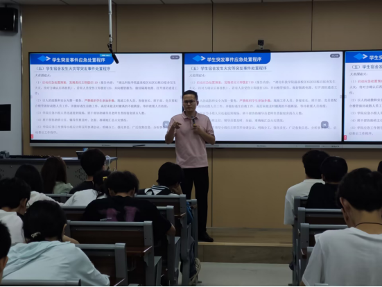 培训过程中,肖乐老师强调了应急事件处理的工作原则——首遇负责制、生命至上和信息报告制,要始终把保护师生健康和生命安全放在第一位,特别是对受伤人员要迅速组织救治。他阐述了危机事件的类型,涵盖了心理危机、安全事故、火灾、网络舆情、电信诈骗等多个领域,让同学们对可能面临的危机有了清晰的认知。