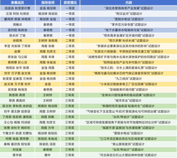 在本届大赛中,湖北科技学院资源环境科学与工程学院地理科学专业学子表现优异,成果丰硕。在王树婷、周霞、金强、杨剑锋、秦艳艳等教师的精心指导下,多支学生团队积极备战,凭借扎实的专业素养、创新的设计理念与严谨的命题逻辑,最终荣获一、二、三等奖在内的多项奖项,充分展现了我校地理师范生优秀的教学设计与创新实践能力。