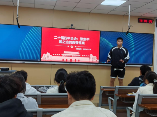 (通讯员:谈仙芳 王诗莹 万雨晴 邹佳仪 审核:何国松)为深入学习贯彻二十届四中全会精神,引导青年学子在国家治理现代化进程中找准青春坐标,11月16日下午,资环学院团委召集了资环学院学生会干部、第五期青马班全体成员及全院各年级所有团支部团支书等主要团学干部60余人次,于教二405开展“聚焦中国之治,贡献青春力量”主题团日学习活动。