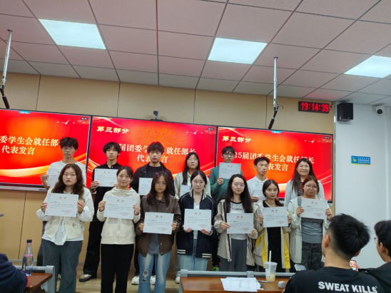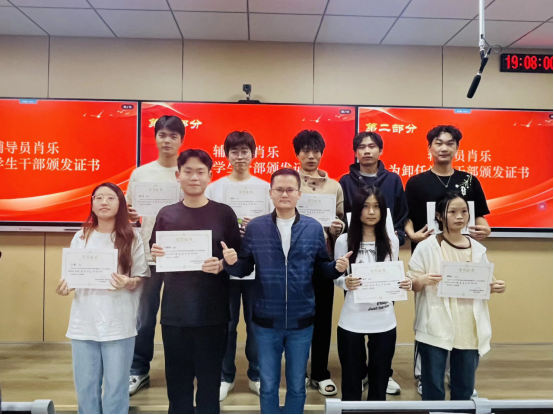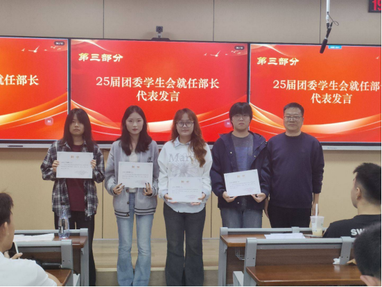 大会在庄严而热烈的氛围中拉开帷幕。首项议程由团委学生会卸任部长代表发言。24届部长深情回顾了任职期间的工作历程,分享了自己在活动策划、团队协作与服务同学中的成长与感悟,并对新一届学生会成员提出殷切期望。紧接着,辅导员肖乐老师为卸任学生干部颁发荣誉证书并合影,这份荣誉证书既是过往奋斗岁月的见证,也是学院及团委对卸任干部们工作的认可。